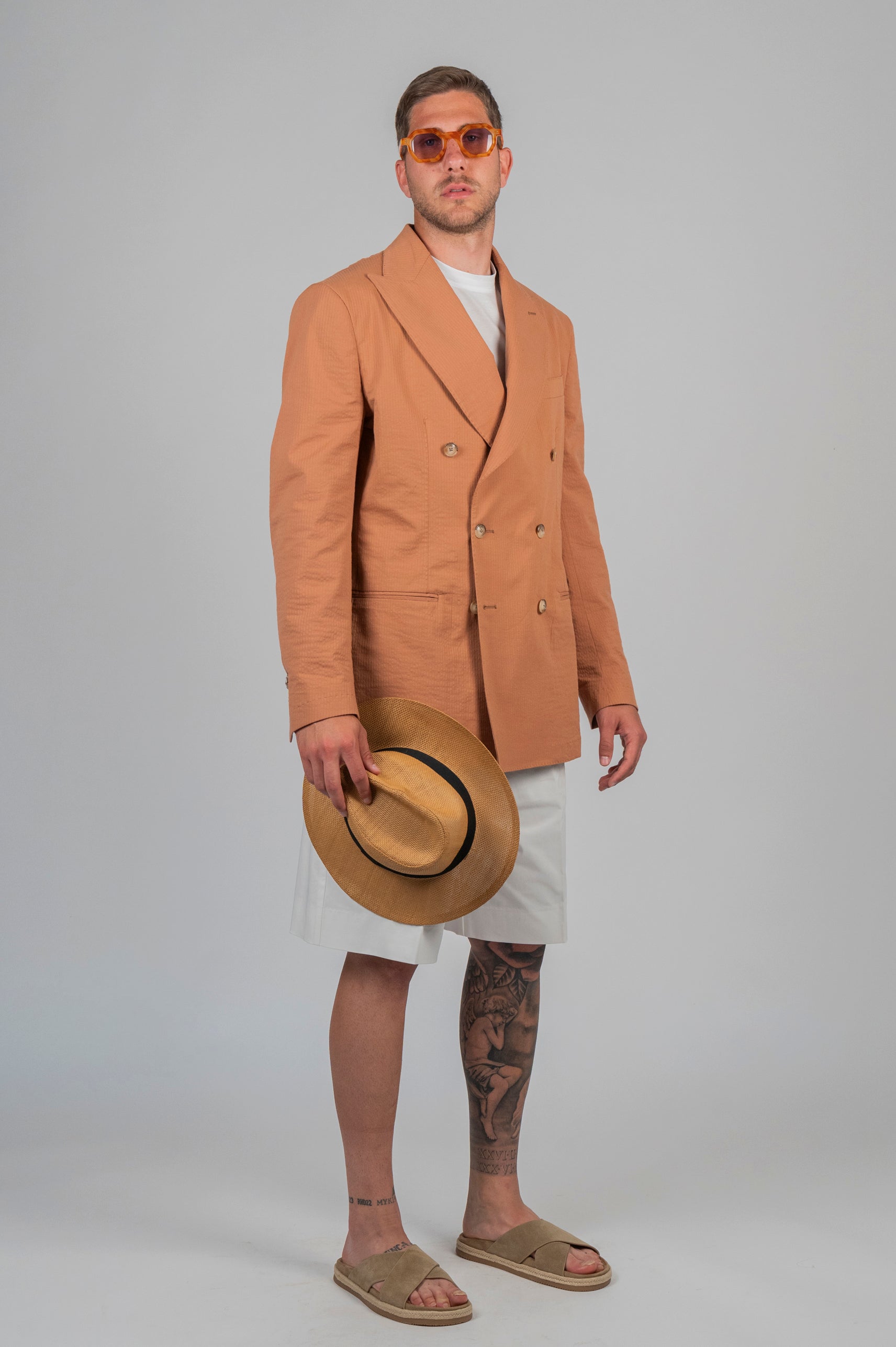 La doppiopetto napoletana che non teme il caldo. Izanagi è il perfetto bilanciamento tra imponenza e disinvoltura, dove la tradizione del doppio petto incontra tessuti leggeri, lavorazioni sartoriali destrutturate e un’estetica elegante senza rigidità.